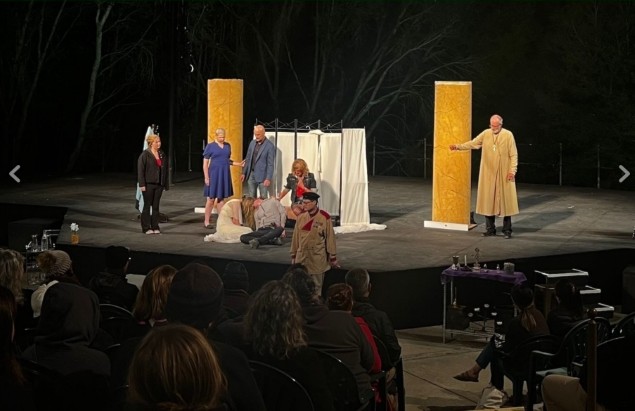 "With an amazing voice production, the actors elicited a range of emotions from the audience. Especially the dramatic scenes that included Prince Hamlet encountering the ghost of his father" (ghost played by Bill Brobeck).